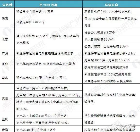 在國家政策和各省市新能源汽車產銷量的影響下,國內代表性地區紛紛制定出到2020年省市充電樁的建設目標,從國家層面至2020年集中建設交換電樁1.2萬座,布局于公共場所等的分散充電樁480萬個,其他省市均從電動汽車的推廣、充電樁的建設和充電服務費角度規劃充電樁的建設布局。
